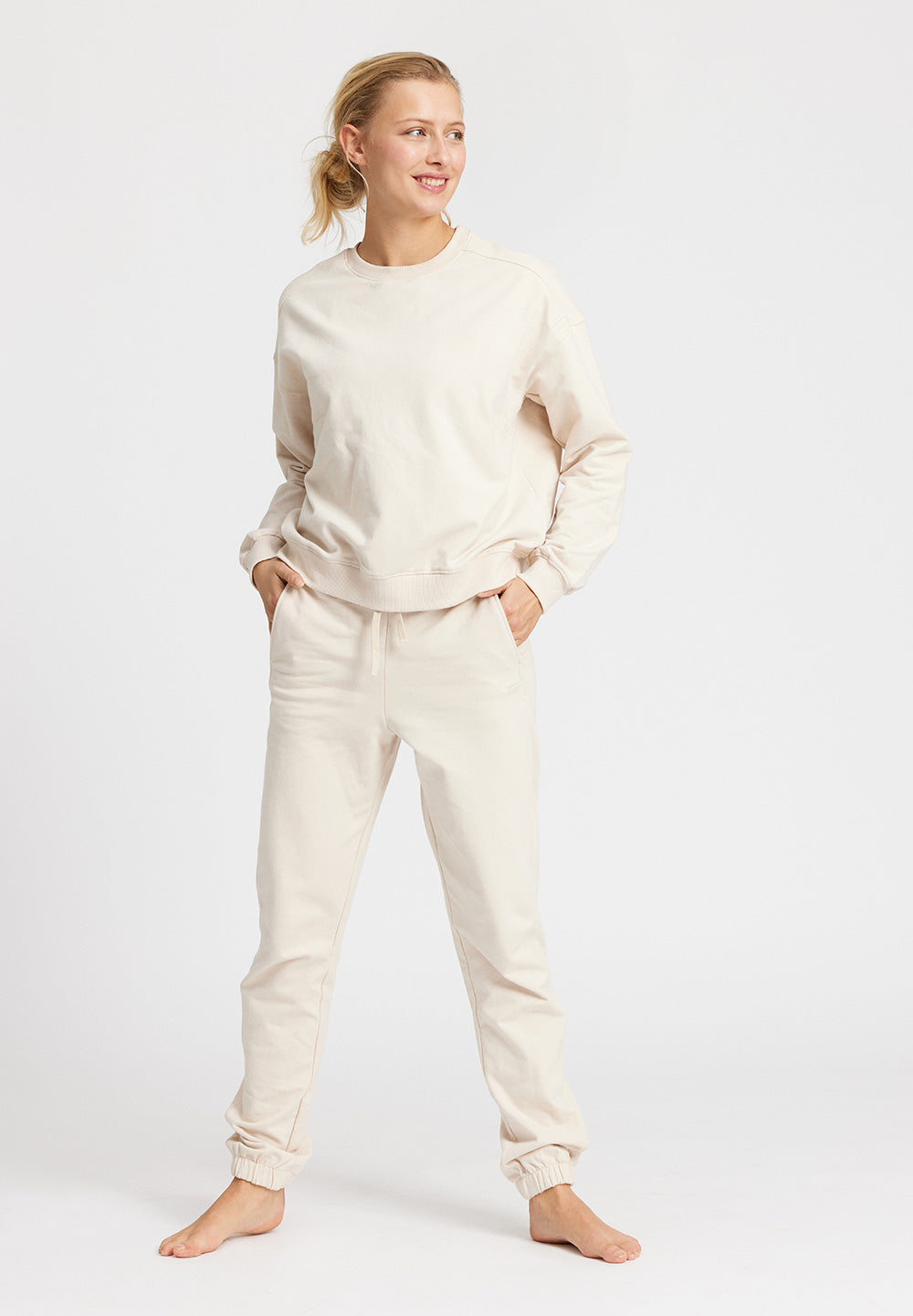 Sweatpants i blødt økologisk bomuld med en smule elastan for at bevare pasformen. De har en lettere oversize pasform med lommer, bløde ribkanter ved nederste kant og et bindebånd ved linningen. Der er et lille broderet logo på bukserne. Den afslappede pasform gør det behageligt for dig at have på som loungewear og passer perfekt til fritidsaktiviteter.