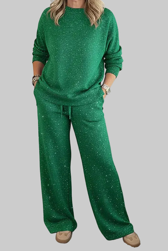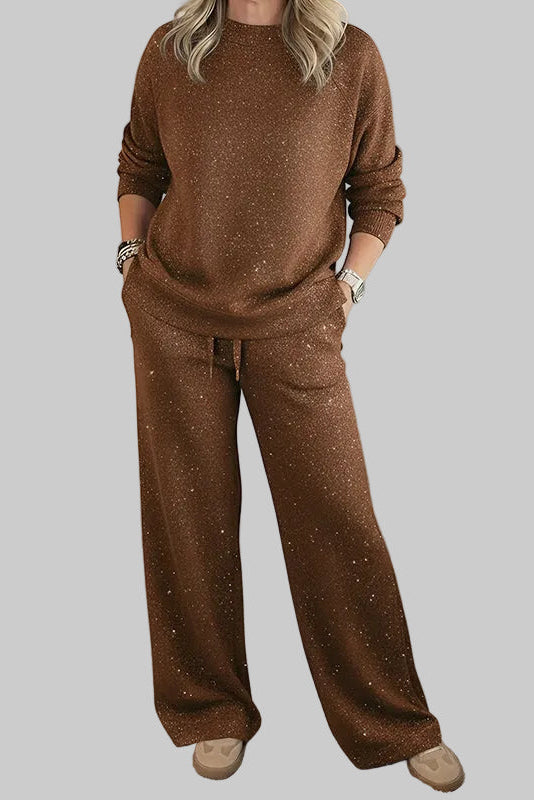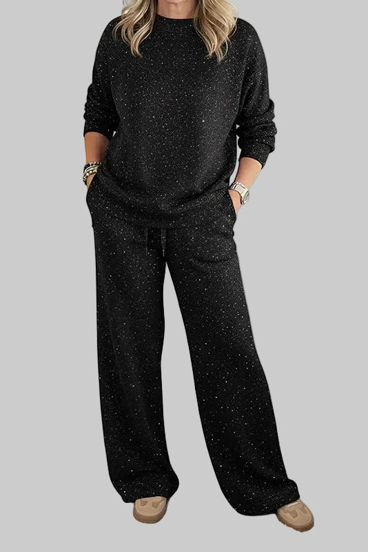 Den bløde strik-top omfavner kroppen med en let og behagelig pasform, mens de løse bukser med elastisk talje giver en flatterende silhuet og maksimal komfort hele dagen.